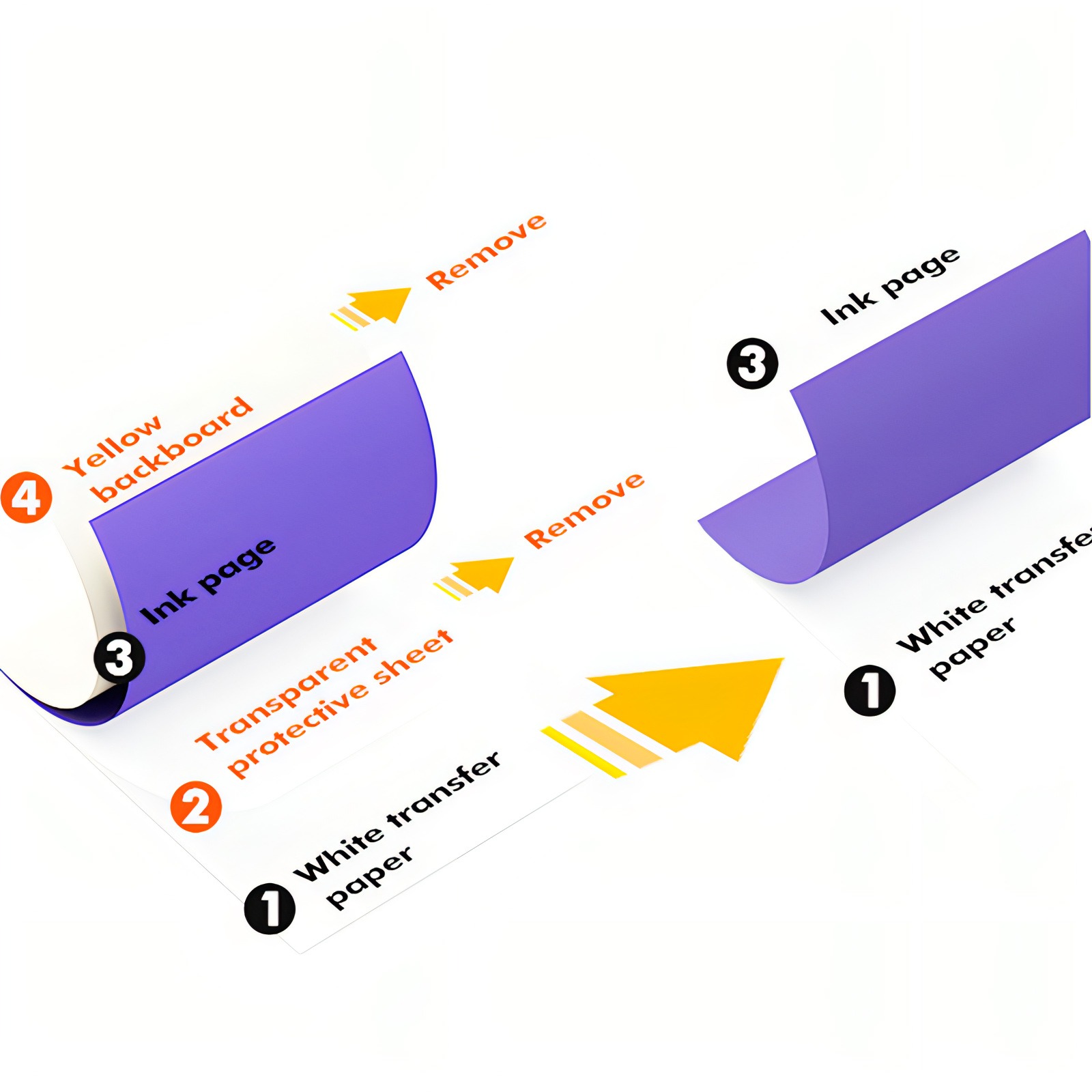 Verwijder de doorzichtige folie en de gele achterkant. Laat het witte overdrachtspapier en de inktlaag zitten.